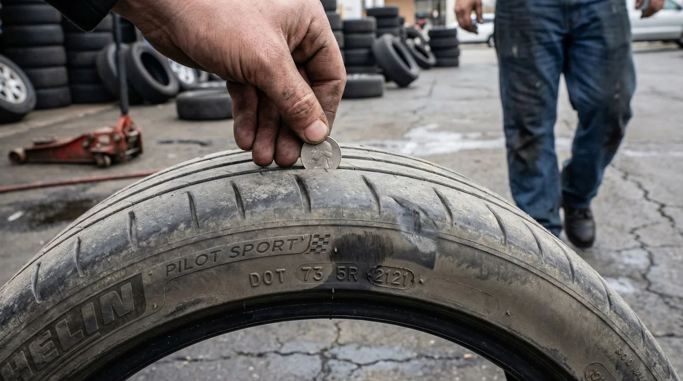 While age determines structural safety, tread depth dictates performance. In city driving, where sudden stops for pedestrians or red lights are common, every inch matters. The legal minimum is 2/32 of an inch, but performance drops off significantly before that.