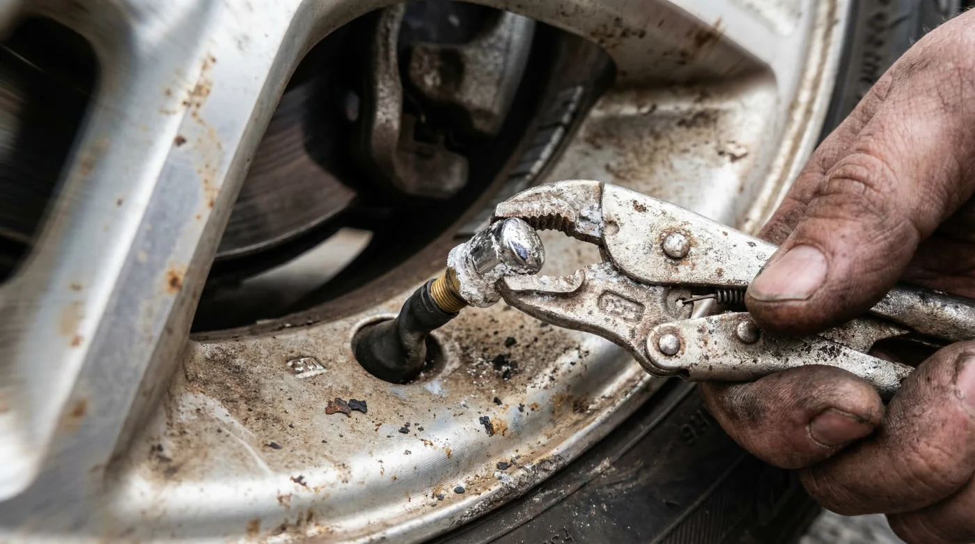 - Symptom: Total immobility of the cap despite using hand tools and maximum leverage. Cause: Complete molecular fusion of the Metal Valve Caps and the hollow TPMS sensor stem, officially requiring full mechanical replacement.