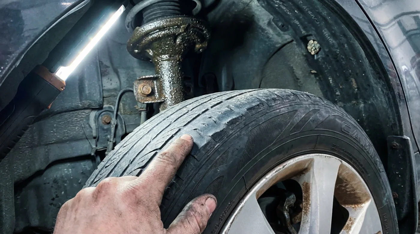 - Inspect the Tread Depth and Pattern: Before ordering parts, run your bare hand flat across the inner tread block of your rear tires. If you feel high and low ridges, the cupping process has begun. If the tread depth in these low spots is at or below exactly 4/32 of an inch, the tires must be replaced alongside the struts.